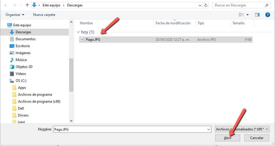 6.- Enseguida se abrirá el explorador de tu computadora para que busques la carpeta donde guardaste la imagen de tu pago, ahora selecciona el comprobante de pago y da clic en el botón “Abrir”:
