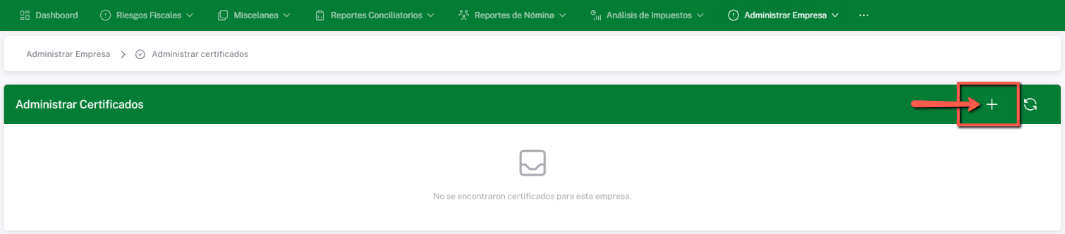 - Da clic en la opción “Registrar Certificado”, identificada con el signo de más (+).