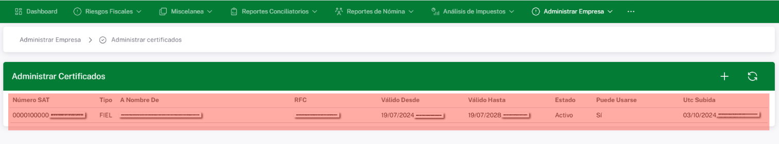 Si los archivos y la contraseña son correctos, el sistema mostrará un mensaje de confirmación y visualizaras los datos de tu FIEL de la siguiente manera: