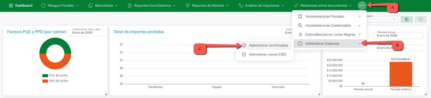 - Al ingresar a Mysuite Analítica, da clic en el ícono de los tres puntos, dirígete al menú “Administrar Empresa” y selecciona la opción “Administrar certificados”.