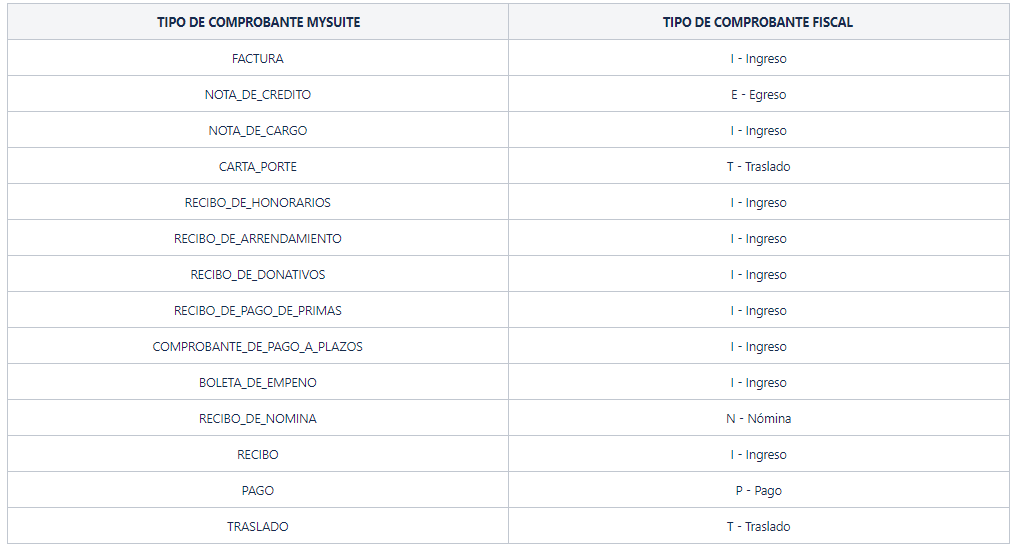 En este elemento debes indicar el tipo de comprobante que deseas emitir siguiendo la siguiente tabla comparativa entre el Tipo de Comprobante MYSuite vs Tipo de Comprobante Fiscal