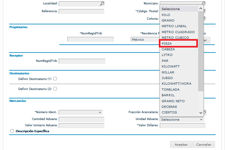 Si tienes varias mercancías deberás asegurarte de estar colocando correctamente la "Unidad Aduana" en cada una de ellas.