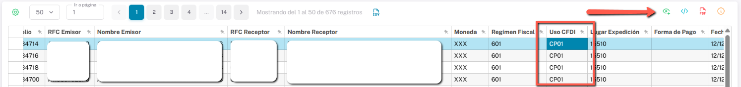 Registros por página: Te permite seleccionar la cantidad de registros que deseas visualizar en cada página, con opciones de 50, 100, 200 o 500 registros.